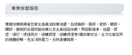 提供專業全身精油按摩,全身油壓按摩,全身推拿,經絡按摩,胸部按摩,腳底按摩,本按摩店位在大台北地區,會館內有多位按摩師傅,均擁有合格執照,專業技術一流。...